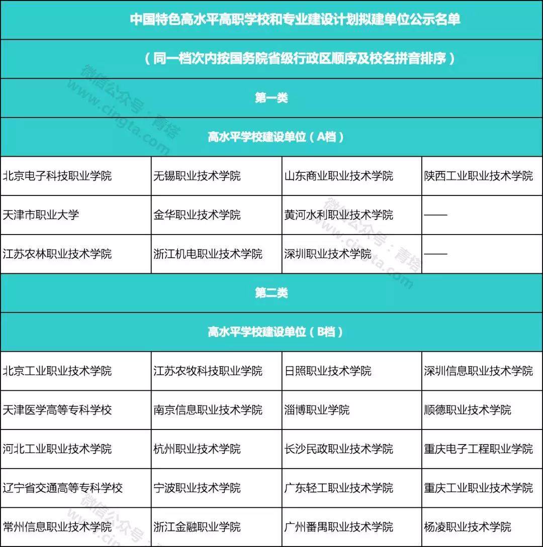 據悉,入圍“雙高計劃”的高職院校分為四類,其中類包括:高水平學校建設單位(A檔)10所;第二類包括:高水平學校建設單位(B檔)20所;第三類包括:高水平學校建設單位(C檔)26所、高水平專業群建設單位(A檔)26所、高水平專業群建設單位(B檔)59所;第四類包括高水平專業群建設單位(C檔)56所。